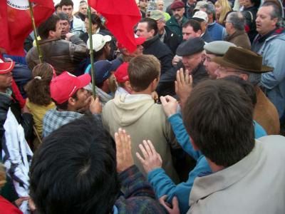 Na foto de Rodrigo Netto (pedroosorio.net), o momento do entrevero entre latifundiários e peões sem terra. Por incrível que possa parecer, esta peleia remonta aos tempos da Gesta Artiguista, quando por 10 anos a Pátria Grande se viu a lutar tanto contra monarquistas portugueses e centralistas portemos.
