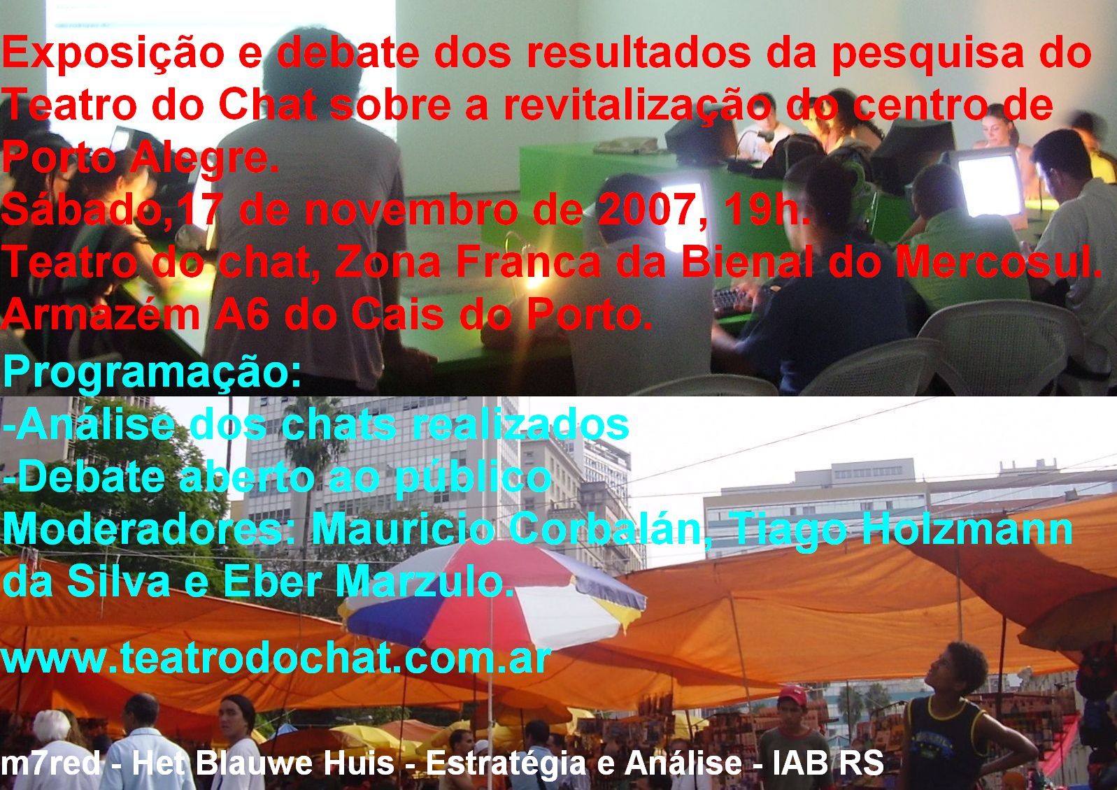 Foto:Convidado por Mauricio Corlan e Pio Torroja, dois arquitetos argentinos, tomei contato com a iniciativa de uma ferramenta de debates chamada o Teatro do Chat. Trata-se de um simulacro de debate em espaço público, onde cada participante assume o papel de um personagem em um campo de interação e dissenso. Embora o ambiente seja tranqüilo e sadio, nada parecido com uma assembléia do Plano Diretor de Porto Alegre, a coisa funciona pra valer. Ou seja, a ferramenta tanto integra como alerta para a luta simbólica e direta pelo controle dos espaços urbanos.